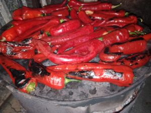 Paprike stavim u rernu da se peku na 200°C, ili na otvorenoj vatri, dok kožica ne pocrni i počne da se odvaja.