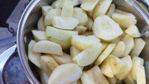 Dodaj malo vode (samo da prekrije dno šerpe) i kuhaj na umjerenoj vatri dok jabuke potpuno ne omekšaju.