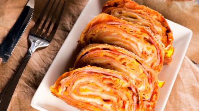 Stavljati po jednu koru (ako su mnogo tanke, po dve). Nafilovati koru, posuti kečapom, pa opet staviti koru. Nafilovati, pa opet staviti malo kečapa i posuti šunkom. Preko staviti koru, pa nafilovati, staviti pečurke, pa malo kečapa. Na kraju staviti koru, pa fil, pa kačkavalj, malo kečapa i uviti u rolat. Ponavljati postupak dok ima materijala. Rolate premazati ostatkom fila i posuti susamom. Peći na 200 stepeni od 20 do 30 minuta.