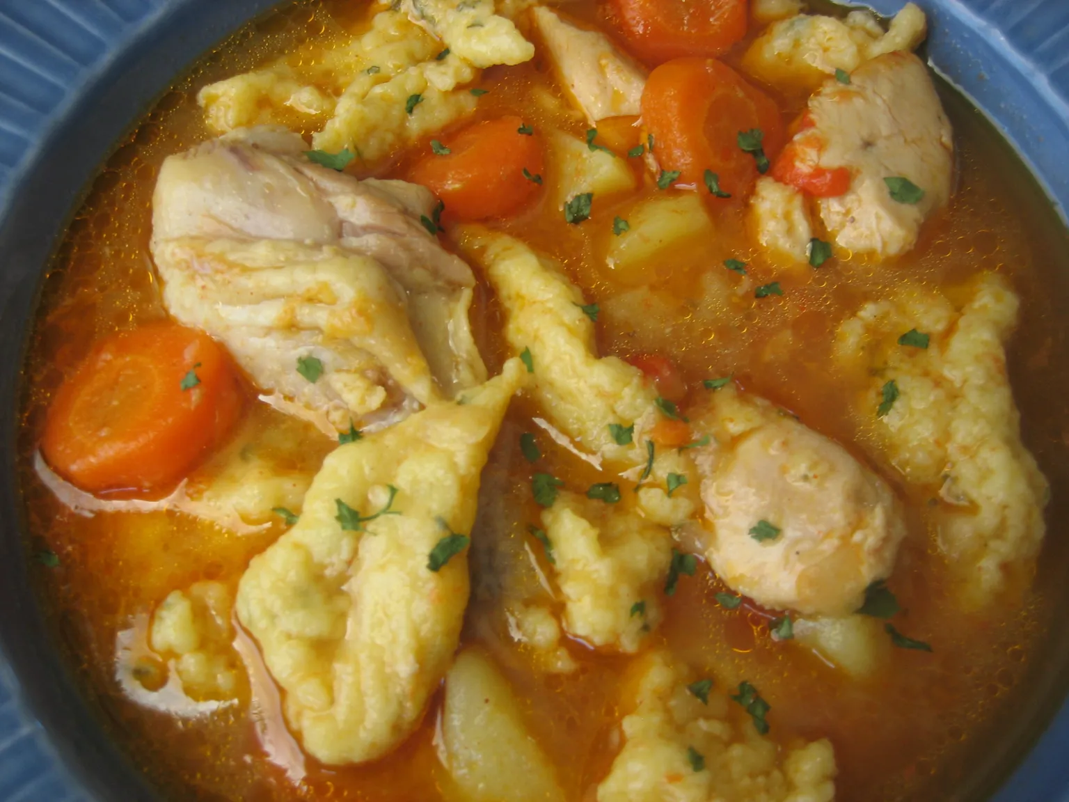 Na kraju dodajte kasiku paradajz pire i nokle vadite viljuskom ili kasikom kako vam je zgodnije.Paprikas je gotov onda kada se krumpir fino da izgnjecit viljuskom i kad se meso lagano da odvojiti od kostiju i kada knedle fino nabubre i isplivaju na povrsinu!Na kraju mozete posuti sitno isjeckanim persunom, biber dodajte po zelji!