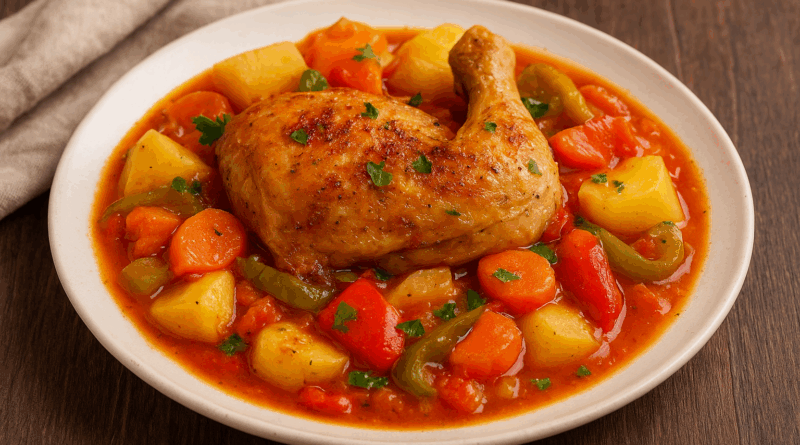 5. Sipam paradajz sos ili narendani paradajz, malo vode i začine. Poklopim i pustim da se krčka na laganoj vatri oko 30–40 minuta, dok meso ne omekša i povrće ne postane sočno.