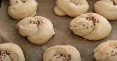 Potom premesite, podelite na tri dela. Svaki deo razvucite na krug veći od tanjira. Tepsiju obložite pek papirom.