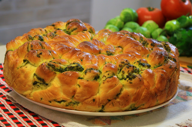 Na jedan krug testa premažite polovinu fila, potom stavite drugo testo, fil, testo. Prebacite u okruglu tepsiju. Uvijajte kako je prikazano u videu. Potom premažite umućenim jajetom i stavite svugde malo margarina. Uključite rernu na 200 stepeni taman neka pogača malo naraste. Pecite je oko 40 minuta. Ako vam se odgore jako rumeni stavite pek papir. Prijatno.