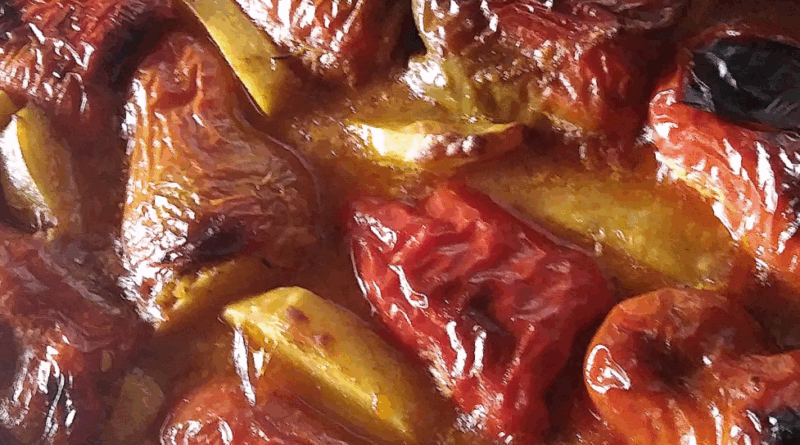 Kada su paprike skoro kuhane, sipam sos u šerpu preko njih i pustim da lagano krčka još 15 minuta, da se sve lijepo sjedini.