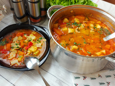 Kad se malo proprži dodati seckan celer, i krompir na kocke. Odozgo dodati ml. papriku i sipati vodu i kuvati oko 30 minuta.