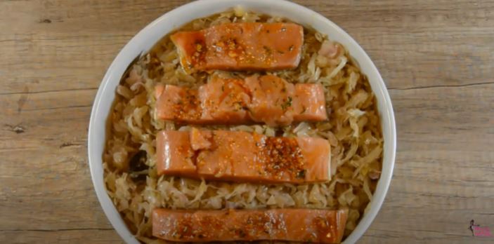 Potrebno: 1 glavica kiselog kupusa, 1 glavica crnog luka, 4-5 lovorova lista, biber, ulje, 500 g lososa.