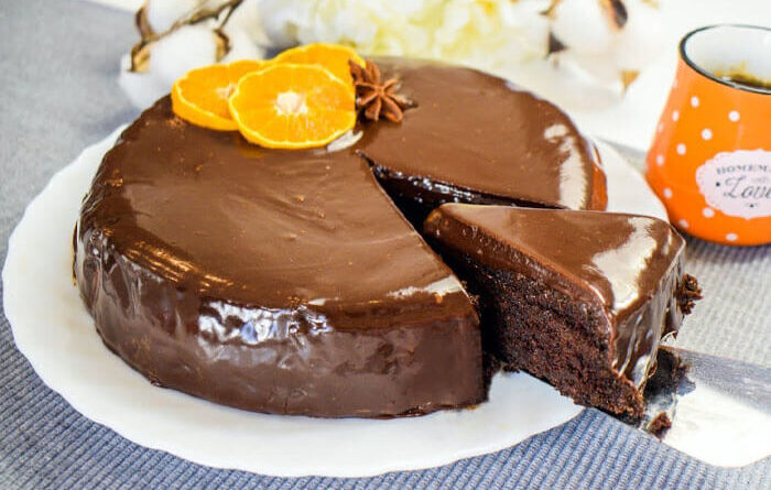 Za čokoladni ganaš ćemo najpre da naseckamo čokoladu za kuvanje i da je prelijemo vrućom slatkom pavlakom pa da sve na kraju promešamo dok ne dobijemo lepu čokoladnu smesu kojom ćemo preliti kolač Po želji možete kolač ukrasiti sa dve kriške sveše pomorandze.