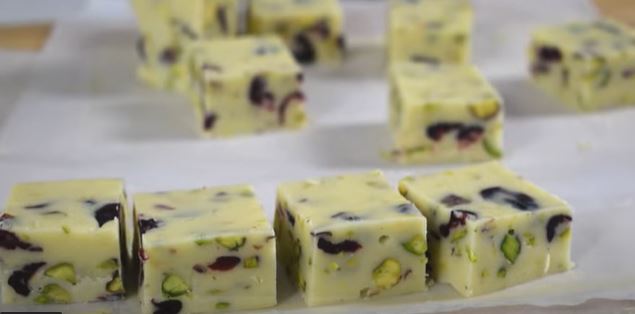 Kad bude vruće, skloniti sa ringle pa postepeno dodati iseckanu belu čokoladu, mešajući između svakog dodavanja. Kad smesa postane glatka i sva čokolada istopljena, dodati brusnicu, koru pomorandže i iseckane pistaće. Sve dobro promešati pa usuti u pleh (veličine 20 x 20 cm) obložen pek papirom ili u silikonske modle po želji, pritisnuti dobro špatulom ili kašikom i poravnati. Meni su najlepši kao obični kvadratići 🙂 Ostaviti u frižider na oko sat vremena dok se smesa lepo ne stegne.