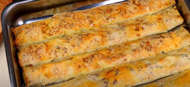 Izmešajte 200 ml. vode sa 50 – 100 ml. ulja (po ukusu) mažite kore, dve – tri pa stavite fil. Umotajte i ređajte u podmazanu tepsiju. Odozgo premažite vodom i uljem i ostavite deset minuta da stoji. Za to vreme uključite rernu na 220 stepeni da se zagreva. Pecite dok ne porumeni, oko 30 minuta.