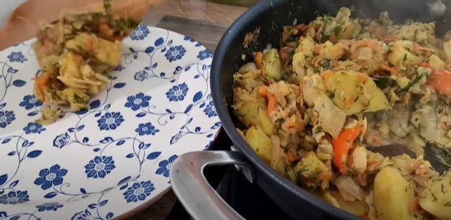 Narendajte 1 šargarepu. Sitno nasjeckajte 1 papriku. Poklopite i ostavite da se sve krčka 15 minuta. Pecite u prethodno zagrejanoj rerni na 180°C 30 minuta. Dodati 3 čena belog luka. Posolite, romarin, dinstajte na laganoj vatri 10 minuta. Kopar sitno iseckati i dodati kad je spreman.