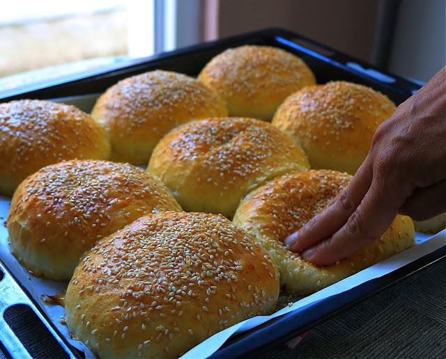 Izmešajte jaje sa maslacem, dodajte vodu i nadošli kvasac. Zamesite testo, dobro ga izradite i ostavite 30 minuta. Podelite na manje jednake delove i napravite loptice. Ređajte na podmazanu tepsiju, prekrijte folijom ili kesom za zamrzivač, krpom i ostavite da stoje sat vremena. Premažite umućenim jajetom i mlekom, pospite susamom i pecite oko 20 minuta na 200 stepeni. Ja stavim na dno rerne manju tepsiju ili posudu sa vodom da isparava dok se pogačice peku.