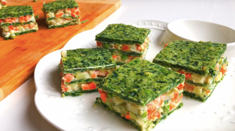 Kora je od spanaća, a fil se sastoji od povrća za rusku salatu (krompir, šargarepa, grašak) i rendanih kiselih krastavčiča sa posnim majonezom i senfom.