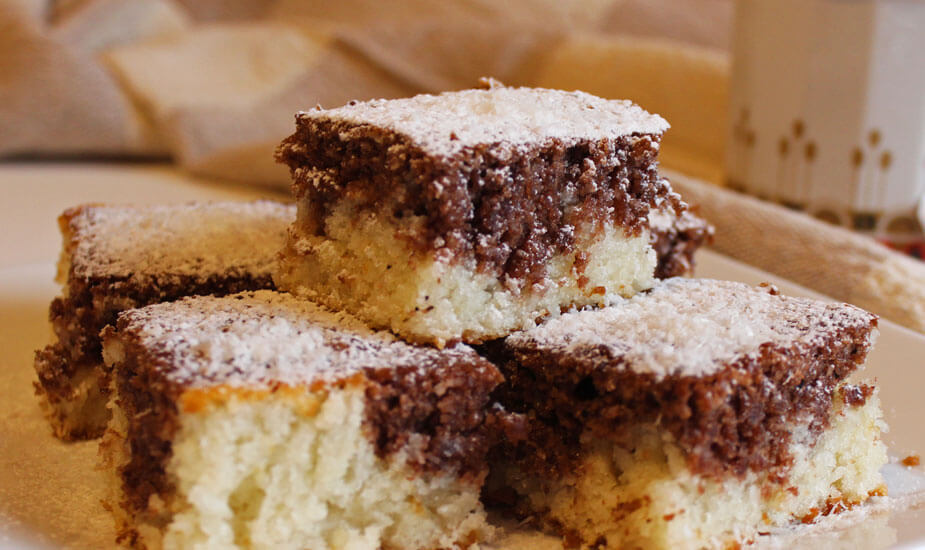 Umutiti jaja sa šećerom, dodati vanilin, mleko, maslac, brašno i prašak za pecivo. Sve dobro izmešati da ne bude grudvica i od mase odvojiti 2,5 šolje u posebnu činiju. U taj deo umešati kakao sa malo vode.