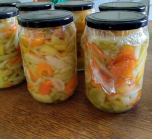 Nalijevam marinadu – preko povrća sipam vruću marinadu, tako da sve bude potpuno pokriveno. Ako koristim konzervans, dodam ga u teglu prije sipanja marinade.