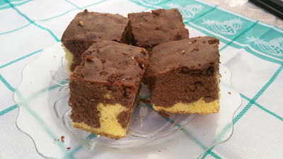 U tepsiju stavite peh papir pa sipate pola testa. U drugu polovinu dodate kakao i lepo izmešate i sipate na belu masu šarajući po tepsiji. Malo prodrmate. Pečete na 200 stepeni C oko 30 min. osetićete miris kolača koji se širi celom kućom. Pečen kolač izvadite na tacnu ohladite i sladite se.