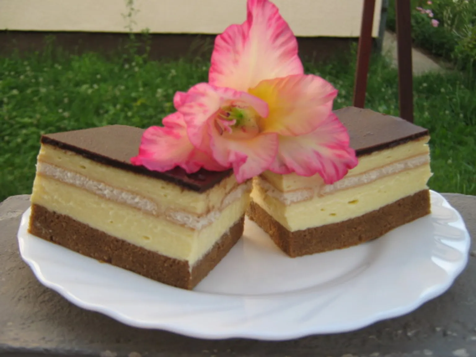 Fini, lagani kolač…idealan za ove ljetne dane….korica natopljena sirupom od šećera i vode, krema sa aromom banane..petit keks i čokoladna glazura