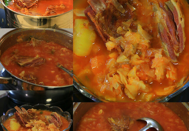 Sitno iseckan crni i beli luk izdinstajte na ulju, dodajte malo vode pa nastavite krčkati 2 minute. Dodajte polovinu iseckanog kupusa i povrća, potom poređajte suvo meso pa prekrijte ostatkom kupusa. Stavite između i grančice peršunovog lišća, dodajte začine, sitnu papriku, kuvani paradajz i oko 500 ml. vode. Ostavite desetak minuta da krčka, pa kad je kupus malo splasnuo dodajte i vodu da prekrije kupus. Kuvajte sve oko 40 minuta, bez mešanja i obilaženja, bitno je da podesite ringlu na neku srednju temperaturu. Na kraju jelo probajte ako treba posolite i poslužite uz domaći hleb ili proju.