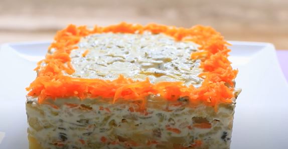 Ja sam filovala na tanjiru na koji sam stavila kalup. Red krompira, premaz, narendana šargarepa i celer, opet red krompira i tako naizmenično. Ostavite salatu u frižideru da se stegne i ukusi spoje. Sklonite kalup i dekorišite.