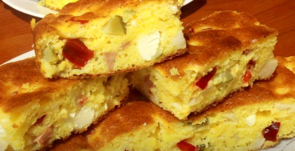 Umutite jaja, dodajte kukuruzno i belo brasno. Zatim jogurt, ulje. Izmesati dodati sir, iseckane krastavce i papriku.na kraju dodati prasak za pecivo i malo posoliti. Izliti u pleh oblozen papirom za pecenje i peci na 200 C oko 20 minuta. Pogledajte nacin pripreme u video snimku: