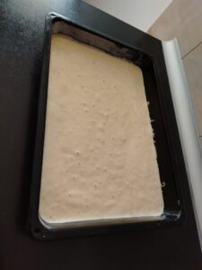 U pouljen i pobrašnjen pleh sipam prvo svijetlu, pa tamnu smjesu – ili obrnuto. Nekad napravim i šare kašikom.
