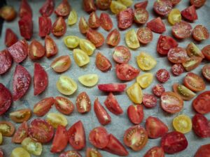 3. Suši u rerni – Uključi rernu na 90–100 °C. Suši paradajze 3–4 sata dok ne postanu naborani, ali još blago mekani. Vrata rerne drži malo odškrinuta da vlaga izlazi.