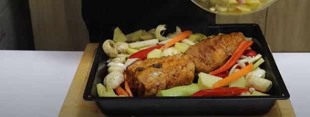 Rolat peći u zagrejanoj rerni na 180c-200c./1h. zatim dodati povrće i nastaviti pečenje još 35min.
