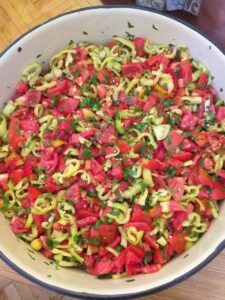 Sve povrće dobro operi. Paradajz nareži na kockice, paprike na trakice, krastavce i mrkvu na kolutiće, a luk na tanke polumjesece. Peršun sitno nasjeckaj.