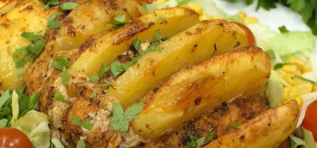 Zatim stavite meso na papir za pečenje, napravite duboke rezove i premažite unutrašnju stranu mesa marinadom. U rezove stavljamo narezan krompir koji takođe premažemo marinadom.