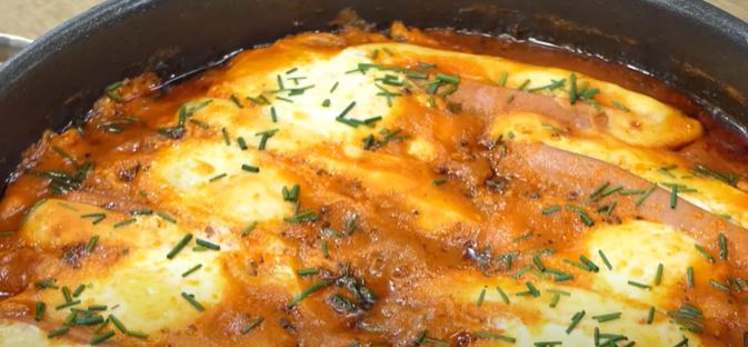 Dodamo kobasice, unapred napravimo rez i u taj rez stavimo sir. Između kobasica razbijte jaja. Kuvajte 8 minuta na laganoj vatri (5. stepen). Pospite zelenim lukom.