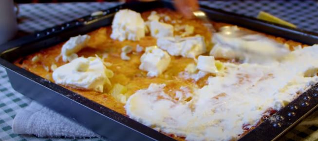 Iseckajte luk i krompir na kockice, umutite jaja pa dodajte ule, jogurt, vodu, začine, brašno. Sve izmešajte pa sipjate u podmazan pleh. Pečeno i vruće isecite na kocke i premažite pavlakom ili kiselim mlekom. Pospite belim lukom.