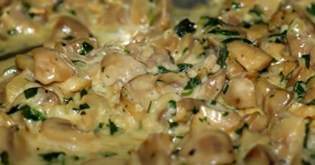 Nakon 15 minuta dodati 250ml domaćeg kajmaka i izmiješati. Začiniti sa soli, biberom, svježim peršunom. Kuhati 3 minute.