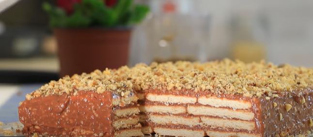 Pripremite manju tepsiju, obložite folijom ili kesom, poređajte 200 gr. keksa, premažite sa dve do tri kutlače fila, opet keks i tako do kraja. Na kraju ne premazujte, već ostavite fila da se posle premaže. Gornji keks premažite malo vodom pa prekrijte folijom ili kesom i držite u frižideru nekoliko sati da se stegne.